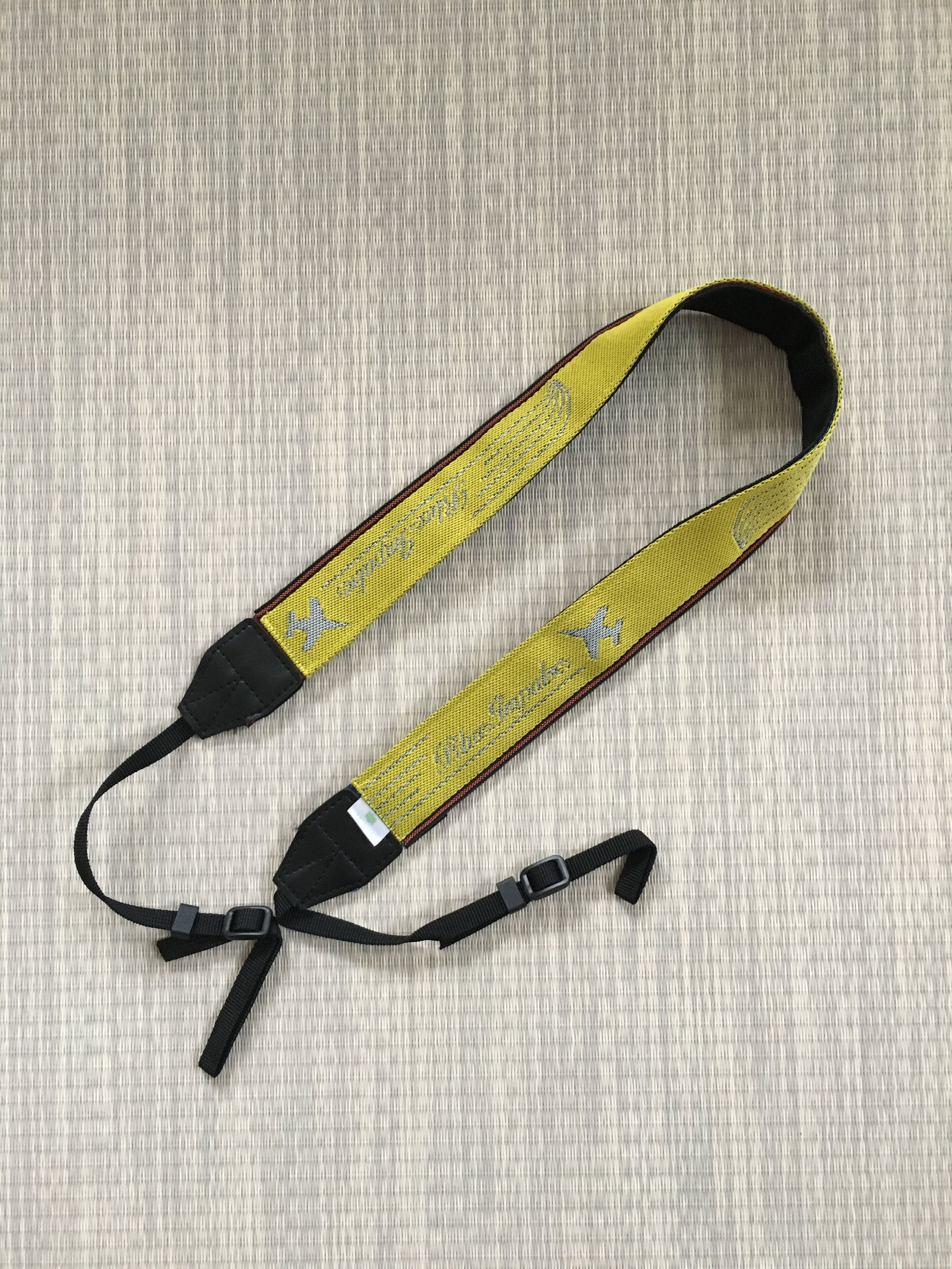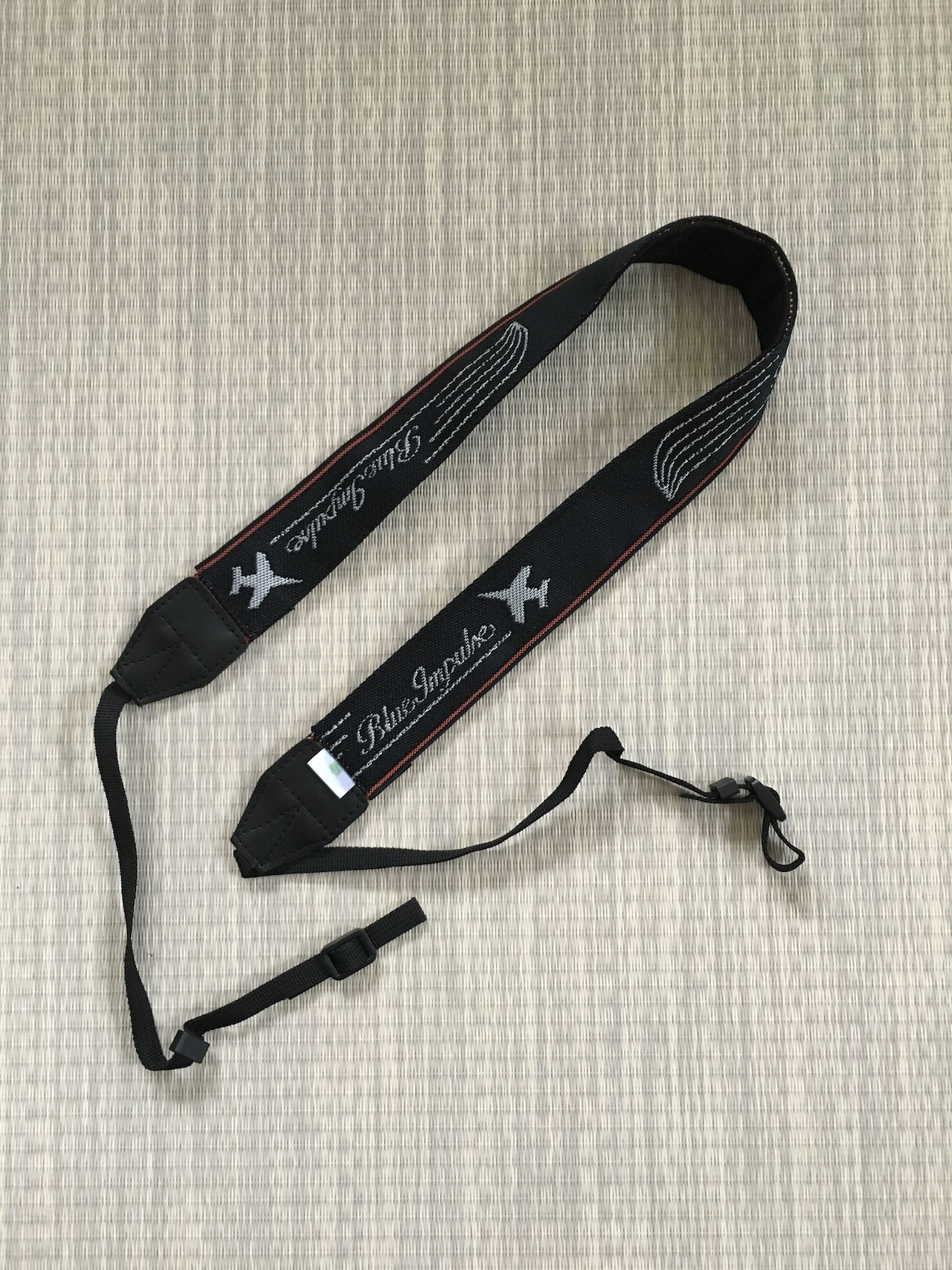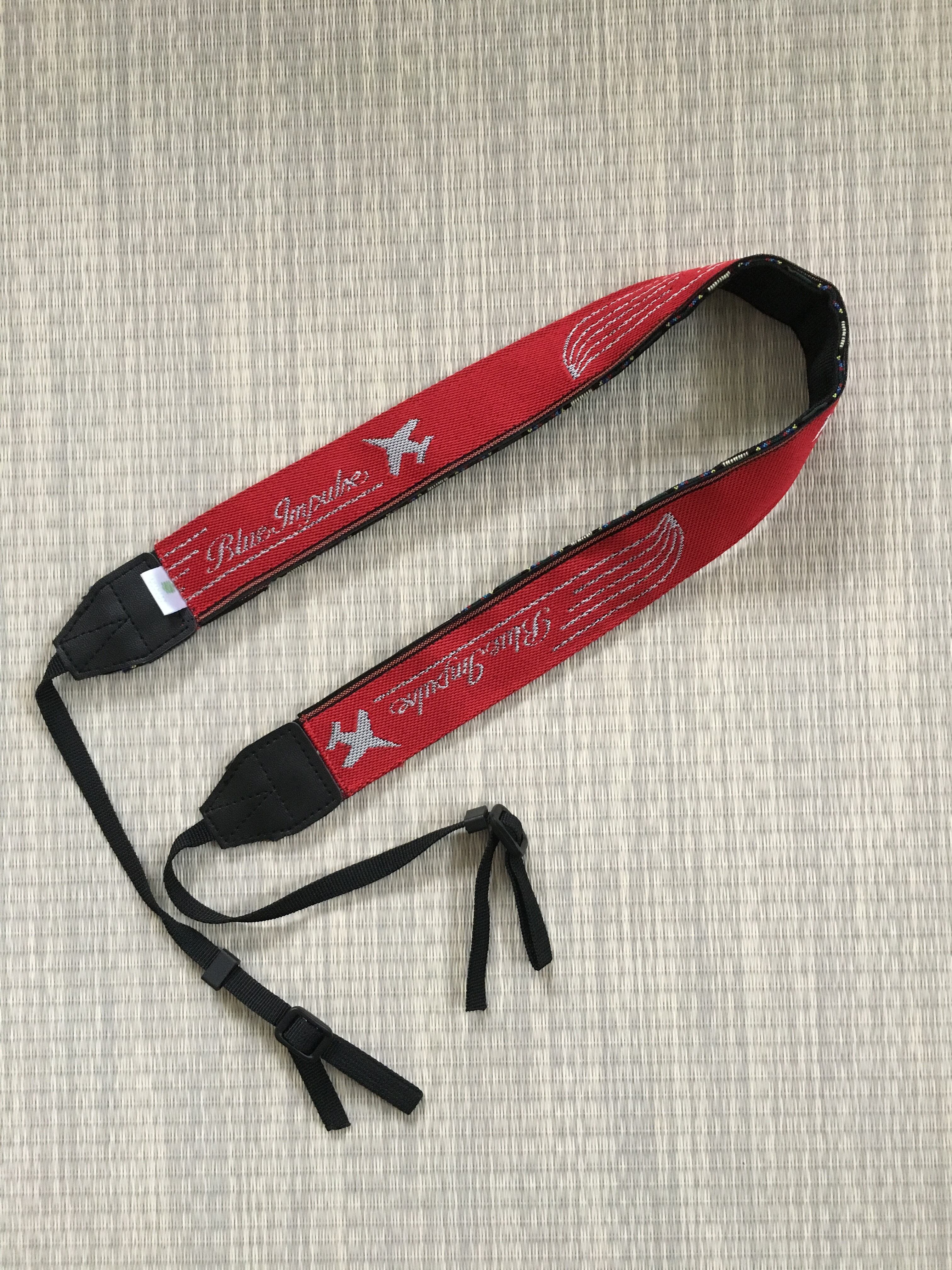 オリジナル畳縁「ブルーインパルス」を縫い付けたカメラストラップです。